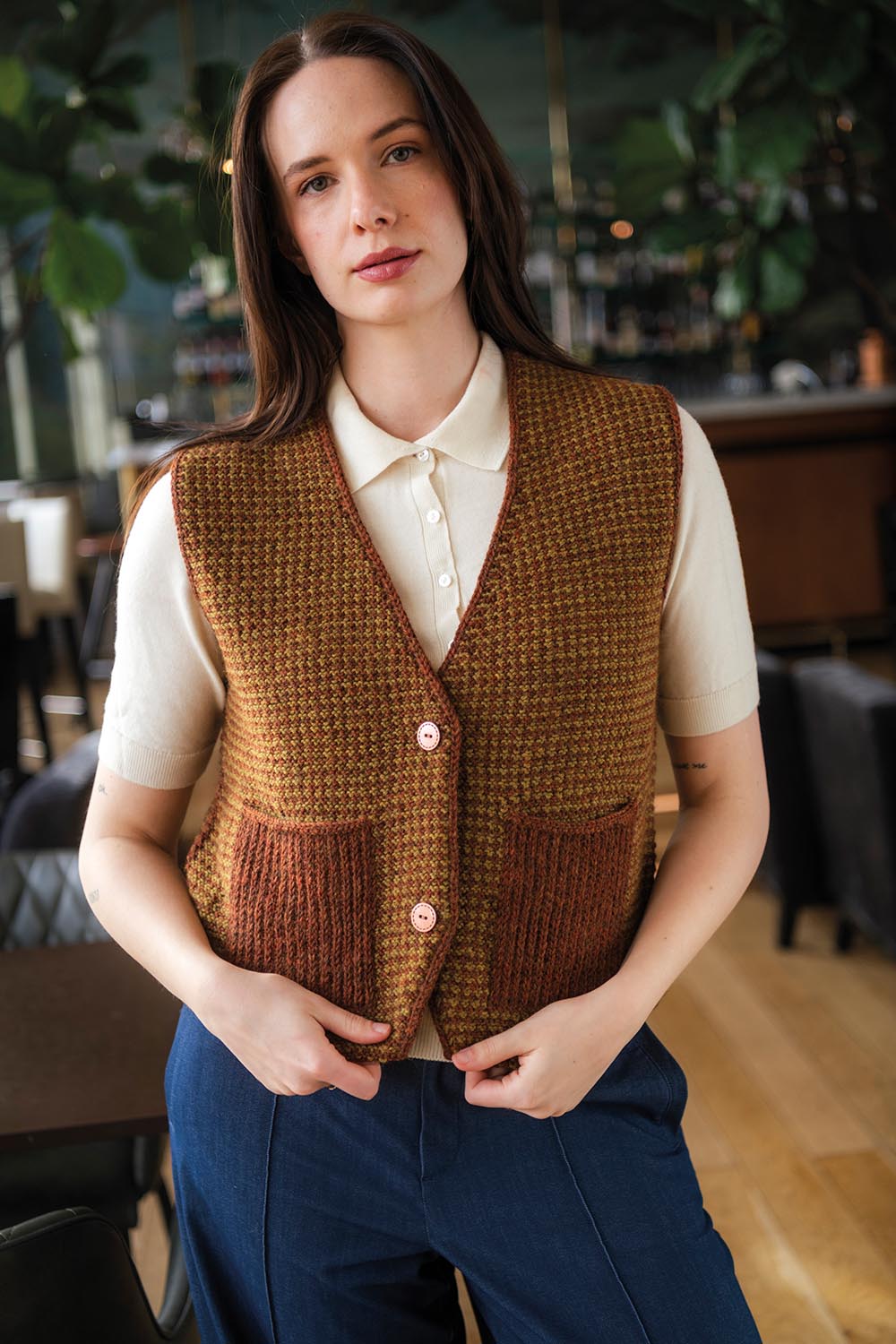 En strukturmönstrad väst inspirerad av tweed- och manchesterkostymer. Strukturmönstret stickas i ränder och lyfta maskor där det bara stickas med en färg i taget. Västen stickas uppifrån och ned och avslutas med i-cord i kanterna. En både utmanande och avslappnad stickning