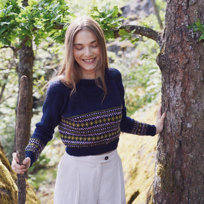 En mönsterstickad ylletröja som har fått sitt namn efter en vacker liten bäck i min barndomsby. Där porlar det djupblå vattnet omgivet av mossa och granskog. Tröjan är boxy i passformen och midjekort för en nutida look. Mönstret är perfekt för dig som vill lära dig flerfärgsstickning eftersom det inte har några långa flotteringar, utan täta färgbyten.