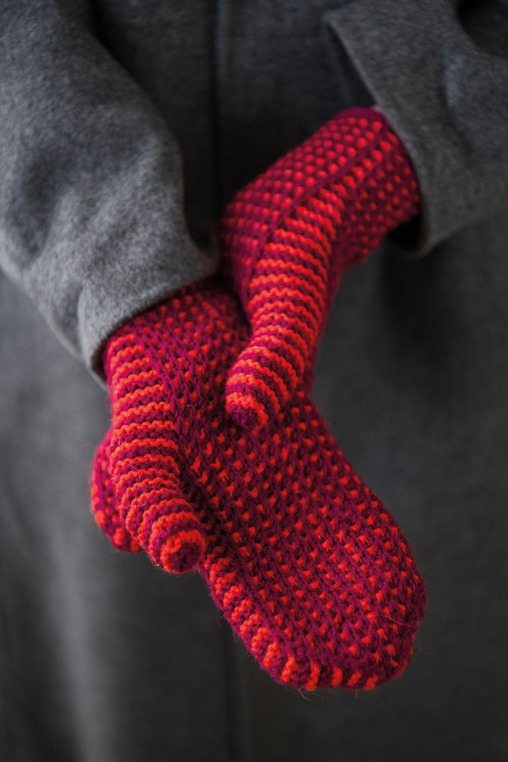 Tunna men täta vantar stickad i två färger där det tweed-inspirerade mönstret utgörs av ränder och lyfta maskor. Eftersom du bara stickar med en färg åt gången ser de mer avancerade ut än de är