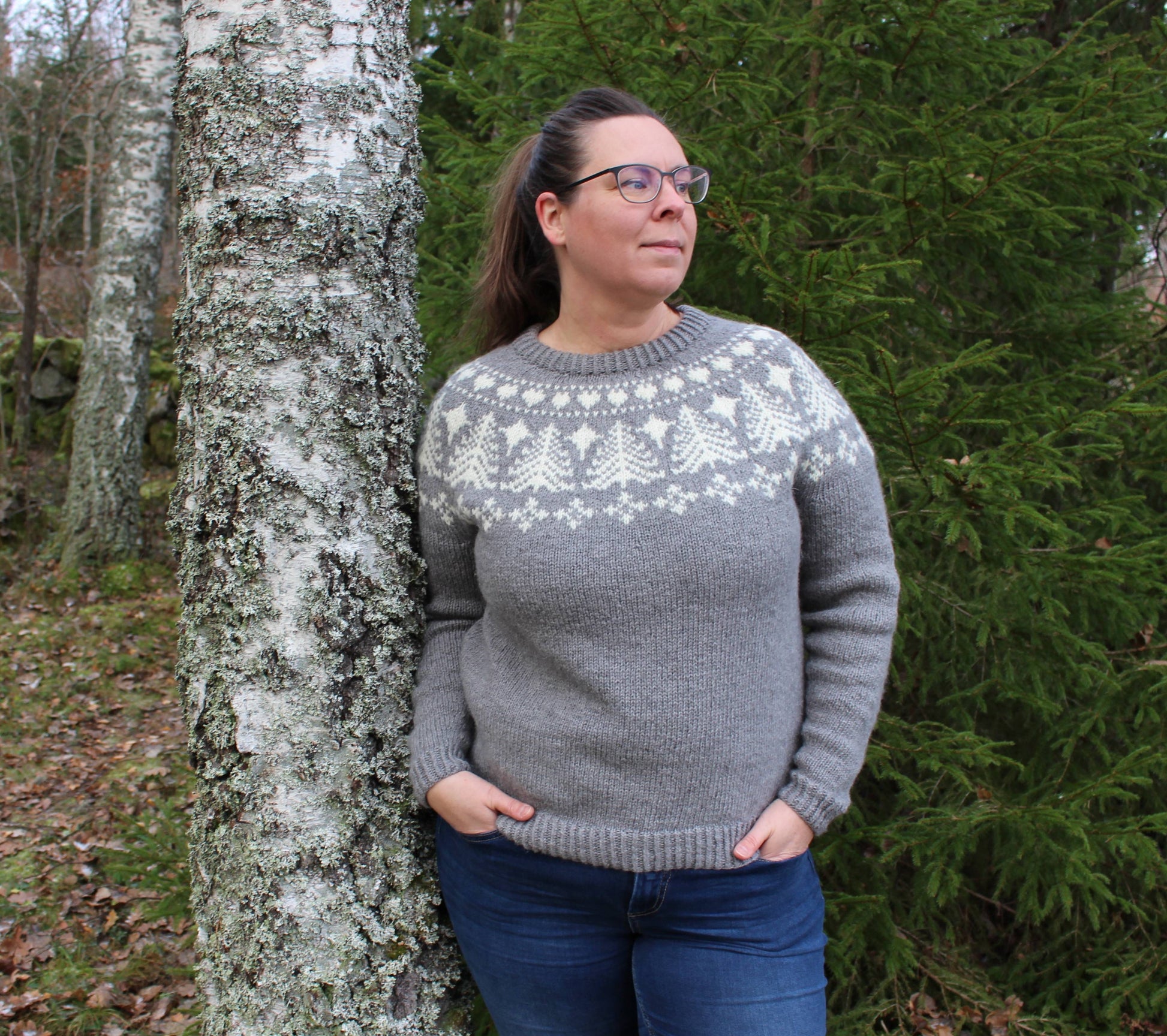 Om du går på promenad i skogen en vinterkväll behöver du en varm tröja. Winter Night Sweater stickas i ull från svenska får; 3-trådig Svensk Ull från Järbo Garn, och värmer gott när stjärnorna lyser klara från himlen. Tröjan stickas nedifrån och upp med vriden resår i muddarna och till sist stickas det vintriga mönsterstickade oket med en kontrasterande färg. Halskanten stickas också den med vriden resår och viks dubbel för lite extra värme vid halsen. Nu kan du känna dig rustad för långa vandringar om vintern!